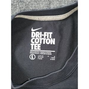 This Nike Dri-Fit Cotton Tshirt in size L features a bold "Just Do It" graphic print. Ideal for sportswear or casual wear, it comes in a versatile black color with a solid pattern.