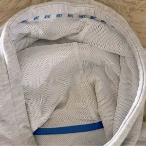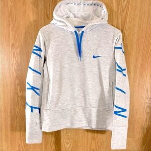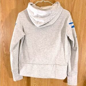 This cute hoodie is in great condition, light gray with bright blue. It has the logo on both sleeves and around the trim of the hood, is a cropped style, has a side pockets and mesh hood lining. This runs a little oversized, fits a small better.