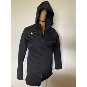 Nike Dri-Fit Hooded Black Jacket Size MEDIUM RN#56323 CA#05553 this hooded Jacket is ideal for running, coaching and officials. double sided zipper allows bottom ease of movement and venting... longer length to keep leg pockets dry. How many days I suffered in coaching when I could have had this... Or when I ran, to be able to unzip from the bottom while the top is closed...