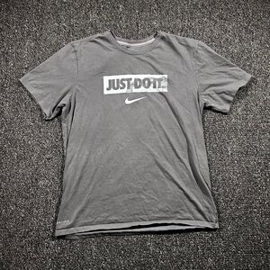 Keywords: Nike Dri-Fit Just Do It shirt, gray Nike athletic tee, men’s large training shirt, Nike gym performance top, swoosh logo running shirt