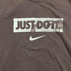 Condition: Good pre-owned condition with light overall wear. Features Nike’s Dri-Fit performance material in gray with a bold “Just Do It” graphic and swoosh logo on the chest. Comfortable athletic fit ideal for workouts or casual wear.