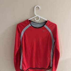 Stay comfortable during your workouts with this Nike Dri-Fit long sleeve running shirt. Featuring a vibrant red body with light grey mesh side and arm panels, this top is designed to wick away sweat, keeping you dry and cool. The iconic Nike swoosh is subtly placed on the front chest. Excellent pre-owned condition, perfect for athletic activities or casual wear.