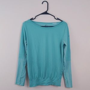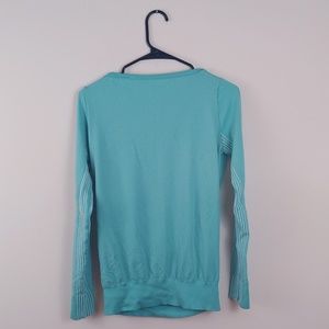 Great condition long sleeve with fitted bottom and stippling on sleeves and sides to allow for better ventilation. Turquoise blue color. Great for exercise, yoga, or athleisure.