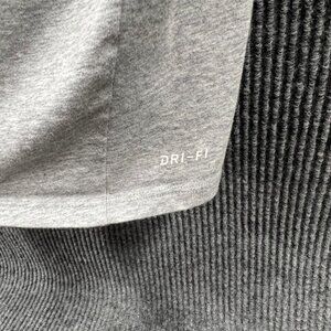 Nike Dri-Fit Mens XL Gray Tee Shirt Athletic Cut Spellout Swirly Logo Graphic