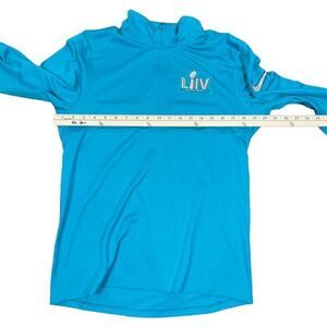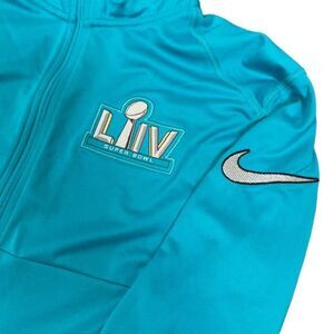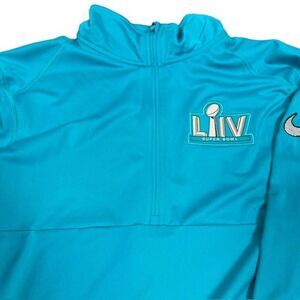 Nike Dri-Fit NFL Superbowl LIV for Air Jordan Half Zip Performance Top Aqua Large. Excellent condition but with one spot on arm as shown- may wash out. Great graphic on chest and nike logo on arm. Turquoise, aqua, teal, with white silver Team NFL Apparel.