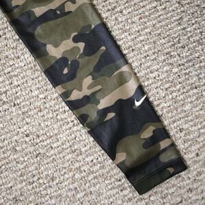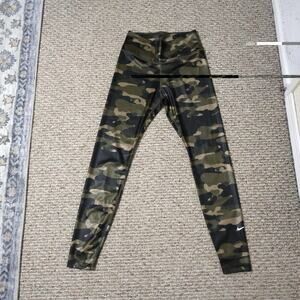 Nike Dri-Fit One Mid Rise Camo Training Leggings Tights S Workout Active. DD4559-222. Olive green. Shiny material. Condition: Preowned. Gently used. Size: S Waist: 24" (27" at waist seam" Rise: 10" Inseam: 27"