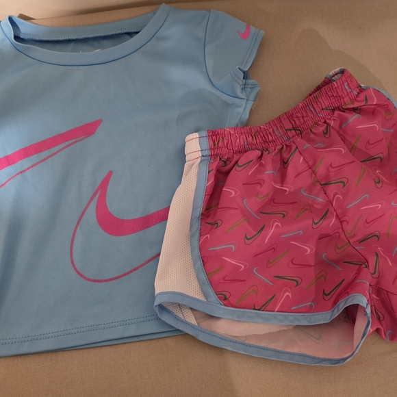 Nike Dri-Fit blue top with pink logo and pink shorts with multicolor swoosh designs. Perfect for active wear. Like new condition with no tears, rips, stains, or pulls. Size 24 months.