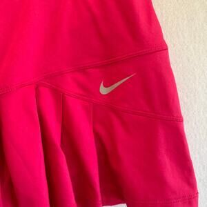 Nike Dri-Fit performance tennis skirt in vibrant pink with built-in compression shorts. Features a flattering pleated hem, moisture-wicking stretch fabric, and reflective logo detail. Designed for comfort and movement perfect for tennis, golf, workouts, or athleisure wear.