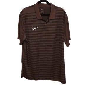 This Nike Dri-Fit Polo Shirt in Brown with a black pattern and white swoosh is a stylish and versatile piece for men. Made from polyester knit fabric, it offers a comfortable and regular fit with a collared neckline, button closure, and short sleeves. Perfect for casual or activewear occasions, this shirt is machine washable and features the Nike Dri-FIT technology for performance activities like tennis or golf during the summer, fall, or spring seasons. The striped pattern and logo accents add a touch of sporty style to this classic polo design.