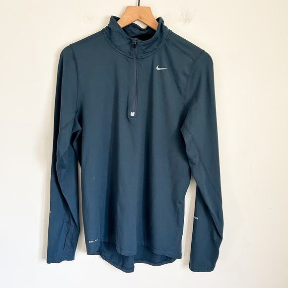Move with ease in Nike's Dri-FIT quarter-zip. This breathable, lightweight sweatshirt wicks away sweat to keep you cool and dry during your workout. The relaxed fit offers all-day comfort, while the quarter-zip closure allows for adjustable ventilation. Built-in thumb holes add warmth and keep sleeves in place, making this a versatile top for any activity. No noticeable flaws, in great condition.