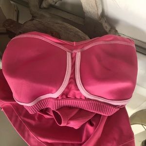 The color is pink, but I see a slight salmon to it, rather than bubble gum or hot/dark pink. I hope that makes sense. Netting details, no polling, built-in bra. Great condition. No stains or issues.