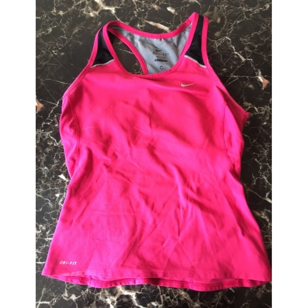 This is a cute pink Nike Razorback that is in great condition. Only worn a few times but the size description is peeling as shown in photos. Dri-Fit and has a built in sports bra. I typically wear a small and it fits me perfectly.