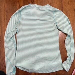 This is a ladies Nike Running Dri-Fit 1/4 zip. It is in great condition, has thumb holes and reflective markings. One wrist shows minor wear and there is some pilling under one arm. The 1/4 zip is teal and white striped with gray Nike logos. Item is a size small.