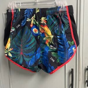 Excellent condition womens size Small black and colorful tropical floral print pull on elastic waist running shorts, Dri-Fit style, has inner liner