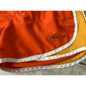Nike Athletic Dri Fit Running Shorts with mesh inner lining size Extra Small XS. Orange and white in color. Lined fitness short. Great preowned condition with no rips or stains. Embroidered Nike Swoosh on the front of the shorts. The inner tagless tag is a bit worn but still readable. Shorts themselves look good!