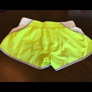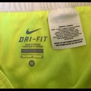 Nike neon yellow shorts. Size med, but definitely fit like a small, so I listed them as a small. Small spots on one part of the back side, but may come out in wash with treatment.