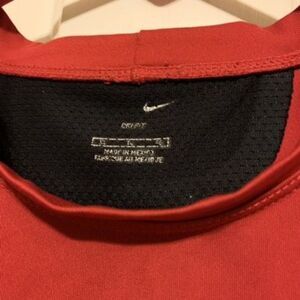 Nike Dri-Fit Size XL Red & Black Sleeveless Base Layer Shirt. 82% polyester/18% spandex. Can’t read rectangular white tag on bottom of shirt. Swoosh on front has some slight cracking. Shirt has no tears or stains and is I. Good condition.