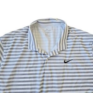 Nike, Modern, Striped, 100% Polyester, Short Sleeve, Collared, Embroidered Logo, Sports, Fall, Summer, Spring, Nike Dri-Fit T-Shirt Men's 2XL Gray White Stripe Collared Standard Fit Normcore.