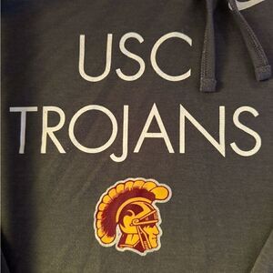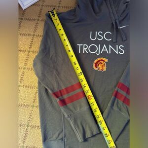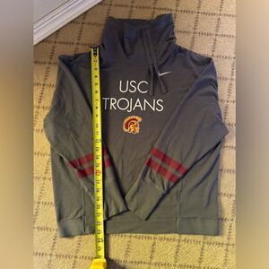 Nike Dri Fit Charcoal gray USC Trrojans logo on front. Funnel collar has an assymmetrical drawstring tie. Long sleeve. Mid weight. Red stripe details on each sleeve. NWOT L