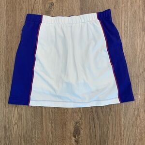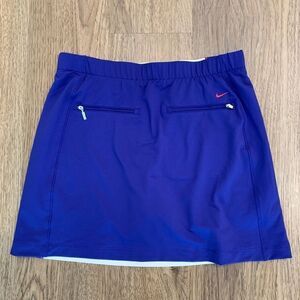 This skirt/skort is pre-owned and shows light sign of wear. The skort is Dri-Fit, has the Nike logo, is polyester blend, 2 front pockets, 2 back zipper pockets, has inner shorts for extra support, and great colorway.