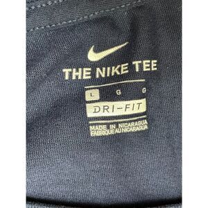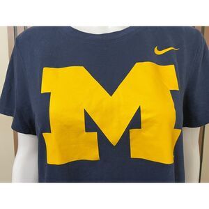 The product is a Nike Dri-Fit Women's Large Blue T-Shirt featuring the Michigan Wolverines football team. Made of cotton, this athletic shirt is designed for regular season events and NCAA tournaments. It is officially licensed fan apparel showcasing the team's colors and logo, perfect for female supporters looking to cheer on the Wolverines in style. The shirt is manufactured in Nicaragua, providing quality and authenticity for fans looking to represent their favorite team on game days.