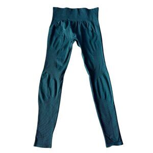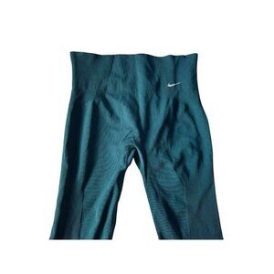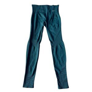 Nike Dri-Fit Power Studio Seamless Training Leggings in dark teal. Leggings are made of a nylon spandex blend and are a woman's size large.