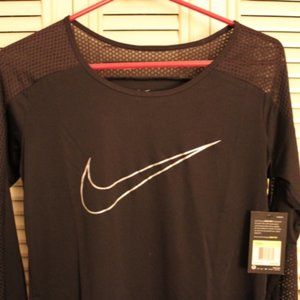 Brand New with Tags - Women's Nike Dri-Fit Long-Sleeve Shirt - Size Small. Dri-Fit Technology. 100% Polyester. The shirt is black and the Nike logo is outlined in Silver.