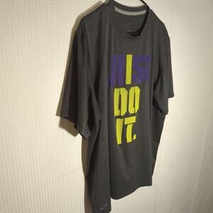 Keywords: nike dri-fit shirt, just do it tee, purple yellow graphic, lakers color tee, mens xl workout shirt, moisture wicking, athletic t-shirt