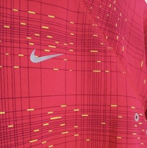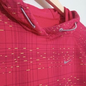 Nike Dri-Fit long sleeve hooded runners athletic top women's size small. Excellent pre-owned condition except for two tiny pin holes that aren't noticeable at all. I examined this article thoroughly and almost missed them because they are that small. This top has a fun, retro design and has thumb holes, reflective silver accents, a mesh vented back and tiny zip pocket. Checks all my boxes but I am not a size small.