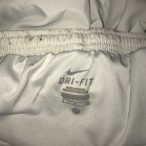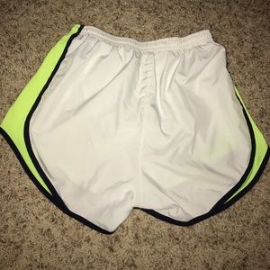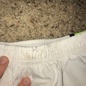 White shorts with neon yellow and navy blue trim. In good condition, a little staining on the waist band of shorts but definitely not visible when wearing them