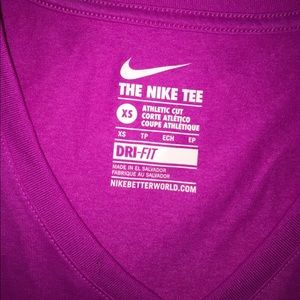 Gently used Nike dri-fit tee. Is a little snug, but very breathable (and cute!) to workout in. Still has lots of life left in it :)