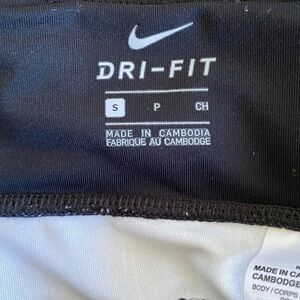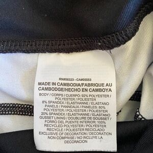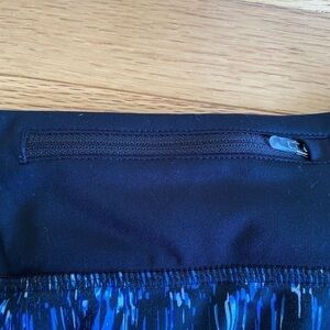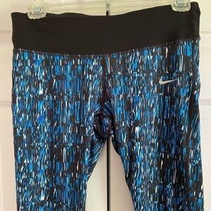 Navy/Royal blue and white patterned leggings. Mesh areas on leg. Back zippered pocket. Draw string waist. 92% poly; 8% spandex. Size small. EUC.