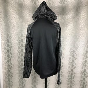 Black sweatshirt with hoodie . Kangaroo style front pocket .
