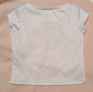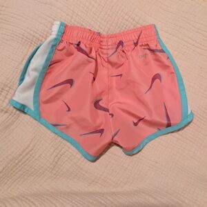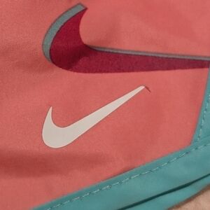 White crop top with teal Nike logo. Coral shorts featuring teal trim and purple logos.