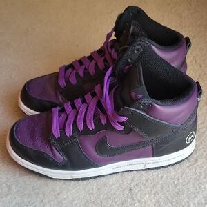 Nike high-top sneakers with bold purple and black design. Features signature swoosh and durable build. Some wear, see pics. Comes with extra pair of purple and black laces.