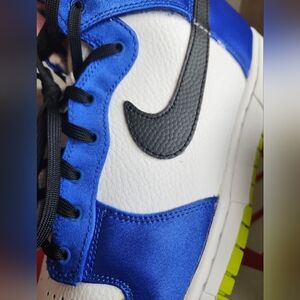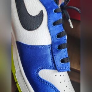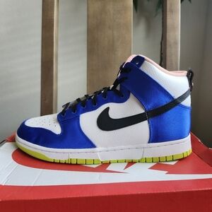 The Women's Blue Satin Nike Dunk High-Top in a White / Racer Blue / Atomic Green / Black colorway sports an upper of white leather with a lizard-like pattern. Unconventional overlays of blue racer satin accent the toe cap, vamp, eye stays, heel, and collar, while a black swoosh of pebbled leather snaps on the heel tab beneath the heel pull. Black laces, a white tongue, and a textured pink textile sock liner round out the vibrant look of this upper. A classic basketball silhouette in bright colors and fabrics that pop and sparkle in this high performance sport shoe specifically sized for women. New condition in original box.