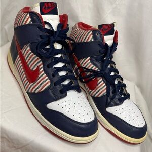 These Nike Dunk High Premium SBs feature a patriotic navy, white, and red striped textile upper with navy leather overlays and a red Swoosh. The midsole has a vintage sail finish paired with a red outsole. Classic Nike branding on the tongue and padded red lining complete the look. A bold and collectible skate shoe with standout style.
