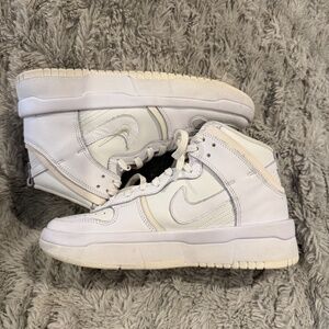 The women's Nike Dunk High Up Summit White (W) features a Summit White leather upper with Summit White and Sail overlays and Swooshes. Atop the Swoosh overlay, a mini Swoosh is embroidered, overlapping the panel. At the base, a doubled midsole and Sail outsole completes the design.