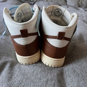 Elevate your look with these Nike sneakers. Brown and white design with striking blue laces. Ideal for casual wear. Size 7 men’s or women’s 9.