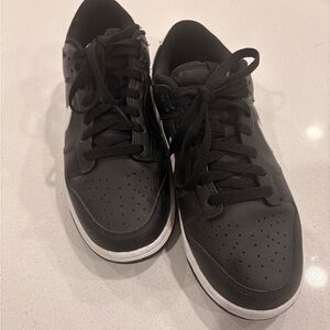 The 'Black Panda' colorway of the Nike Dunk Low is simple and clean, featuring an all-leather build across the upper. Black smooth leather dominates the paneled upper, while white supplies a pop of color on the laces, Swoosh and midsole. Blacked out tongue tags and back heel stitching matches the overall color concept of the shoe, while the traditional Dunk herringbone outsole finishes the look.