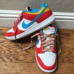 In excellent gently used condition. The Men's Nike Dunk Low LeBron James Fruity Pebbles is a shoe that pays tribute to the sugary cereal favored by NBA star LeBron James. The shoe features a white base with scarlet overlays, a powder blue Swoosh, and multicolor laces. The tongue is decorated with a woven Fruity Pebbles tag, and LeBron's LJ logo is embroidered on the heel tab. The shoe also has a Nike-branded sockliner with a Fruity Pebble graphic print, and a milky translucent rubber outsole for traction.
