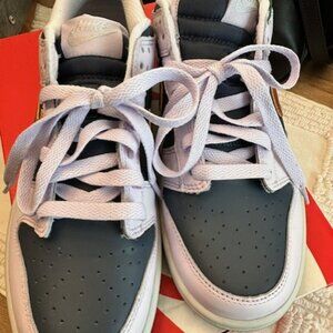 The Nike Dunk Low SE Copper Swoosh (GS) takes the signature Nike Dunk Low silhouette and applies eye-catching splashes of Metallic Copper to the shoe’s subdued colorway of Barley Grape, Thunder Blue, and Violet Frost.