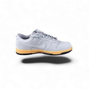 The Nike Dunk Low SE in Wolf Grey features a stylish design with a low top shaft style and lace-up closure, making it ideal for casual or activewear occasions. The shoe's solid gray color with accents of yellow and black adds a pop of color to the overall look. Made with Nubuck upper material and a rubber outsole, this athletic shoe from Nike's Dunk product line is perfect for basketball and other activities. The Nike Dunk Low S