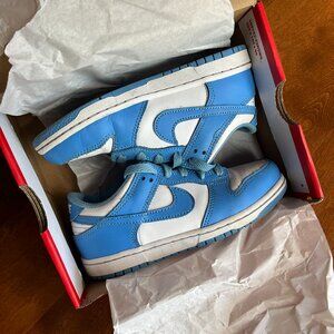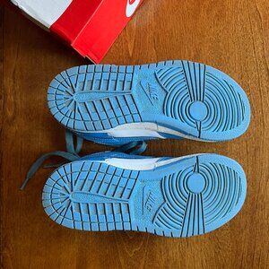 Nike Dunk Low (PS) in UNC "University Blue" and white in kids' size 1Y. Style CW1588-103. Classic swoosh logo on the sides with light blue soles and laces. Includes original box, though it has some shelf wear. VGUC; some wear and discoloration on the laces and soles and interior fabric, a few small marks on the outer leather (see photos).