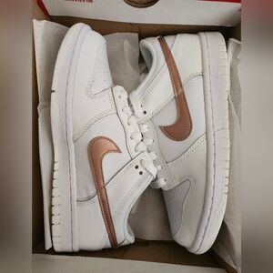 Nike Dunk Low White Pink (GS) is dressed in smooth perforated white leather from heel to toe. Baby pink bronze leather Swooshes appear on the medial and lateral sides, providing some color to the mostly white silhouette. Nike branding appears in white on the tongue tag, embroidered text on the heel tab, and insoles. An all-white sole unit (midsole and rubber outsole) completes the clean, monochromatic design. New in original box. 4.5 Y will fit 6.5 women's.