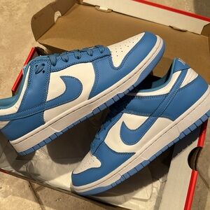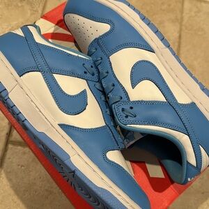 Men’s Nike Dunk “University Blue” size 10.5. Only tried on! Basically brand new. No scuffs, creases, or tearing. Comes with original box.