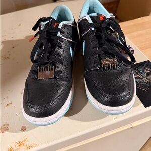 Sleek black sneakers with light blue details. Iconic Nike swoosh on the side.