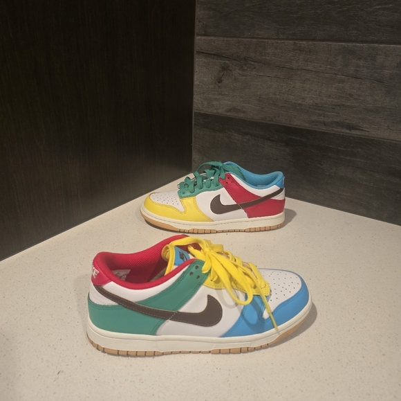 Vibrant low-top sneakers with a mix of colors. Features include a bold design with red, yellow, blue, and green accents.. Size 5.5y which is a 7 in Women.