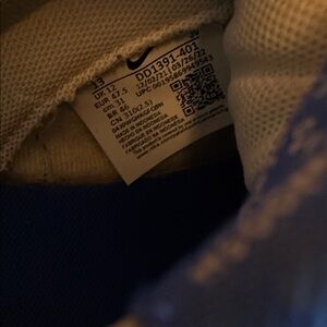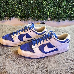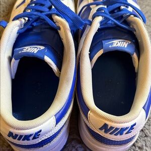 Low-top Nike sneakers with white leather and vibrant royal blue panels. Padded collar and cushioned insole for comfort. Iconic Nike Swoosh on sides. Clean sporty silhouette for everyday wear.