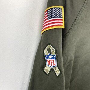 Nike Eagles Salute to Service Sideline Therma Pullover Hoodie Olive S Style 854653 * Features: olive green, 'Salute to Service', officially licensed NFL Philadelphia Eagles, camo hood with drawstring, kangaroo front pocket, long sleeves, Nike swoop logo on left sleeve, Eagles lol on chest, American flag and NFL on right sleeve, Dri-fit fabric, pullover * Size: Small * Condition: no marks or holes Approximate measurements laying flat * Chest: 19.75” pit to pit * Length: 24.5”